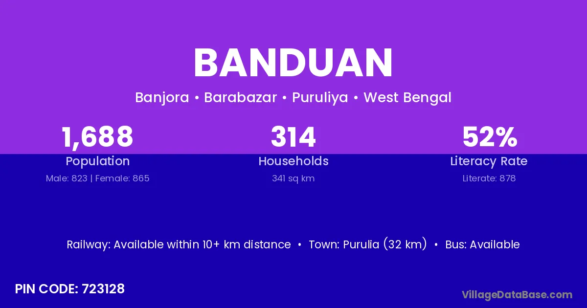 Purulia (32 km) is the nearest town to Banduan village for major economic activities and is located approximately 32 km away.