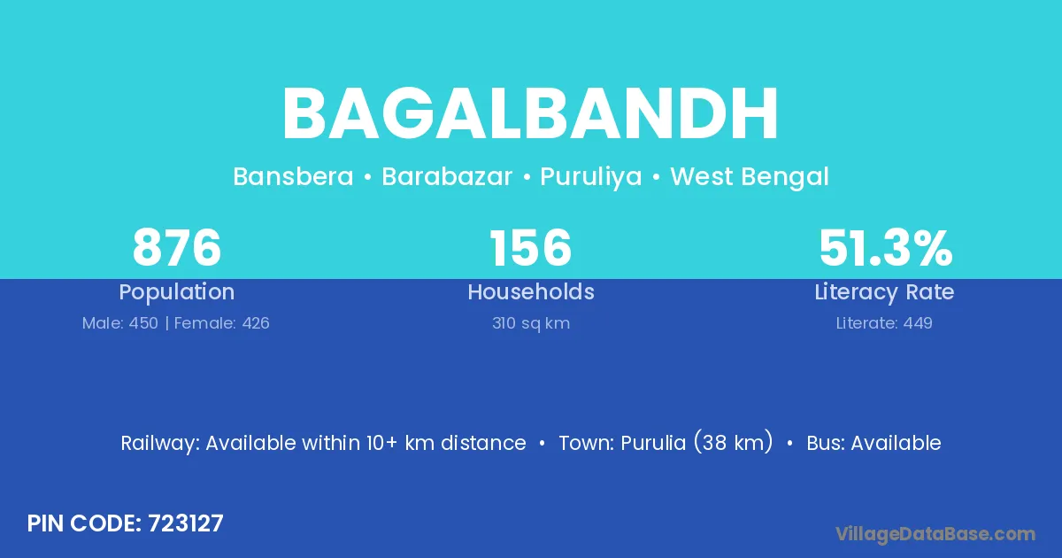Purulia (38 km) is the nearest town to Bagalbandh village for major economic activities and is located approximately 38 km away.