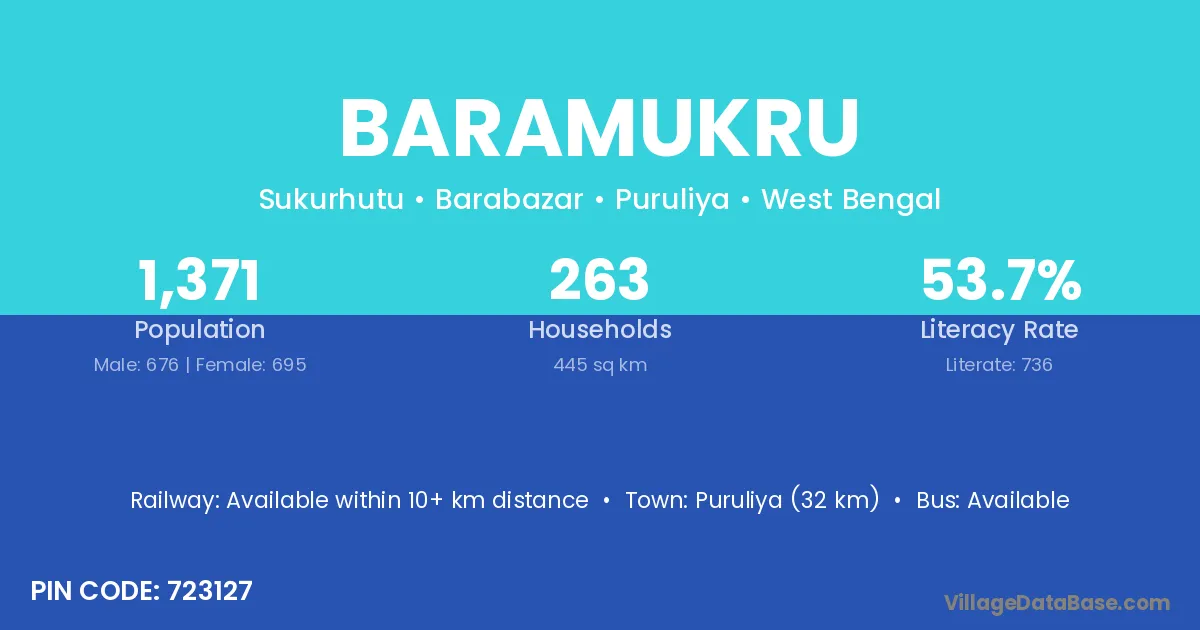 Puruliya (32 km) is the nearest town to Baramukru village for major economic activities and is located approximately 32 km away.