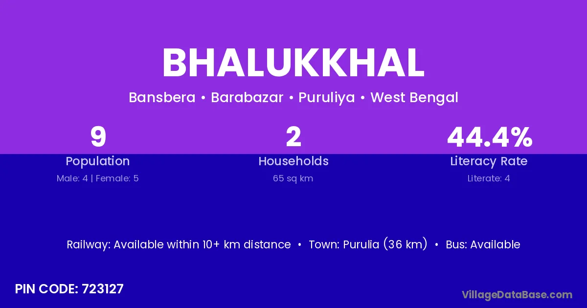 Purulia (36 km) is the nearest town to Bhalukkhal village for major economic activities and is located approximately 36 km away.