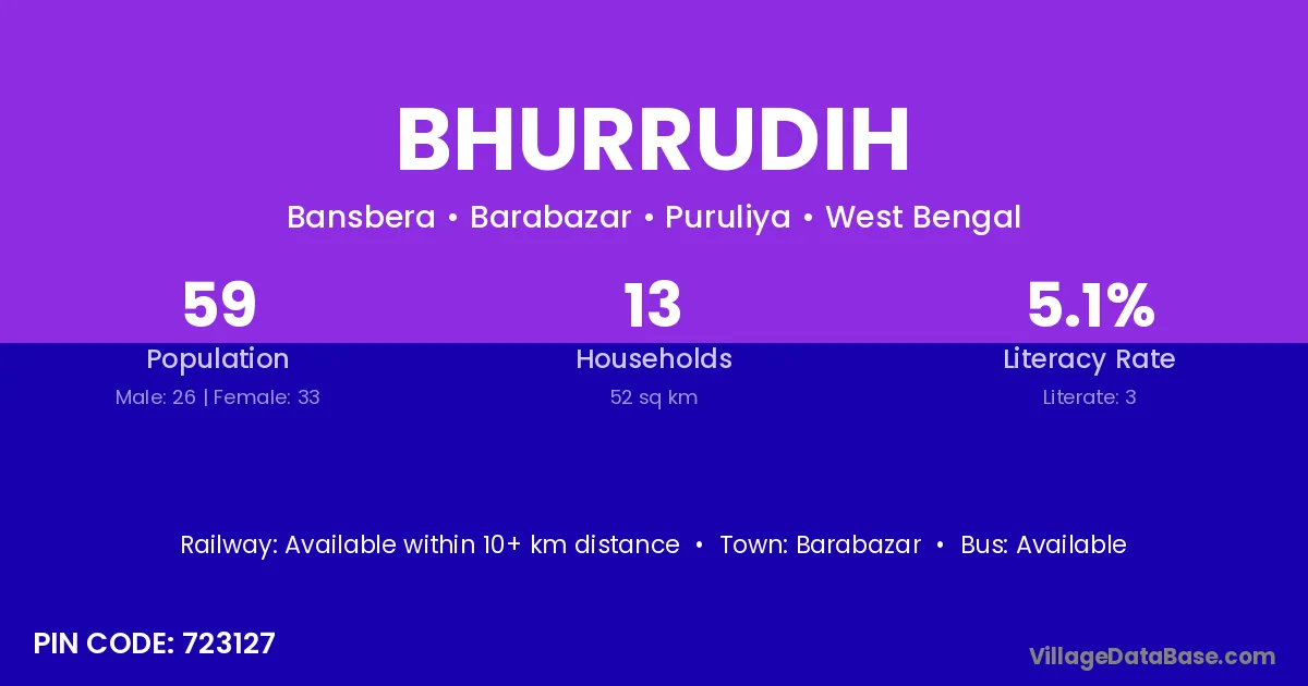 Bhurrudih village has a total population of 59 people, of which 26 are males and 33 are females.