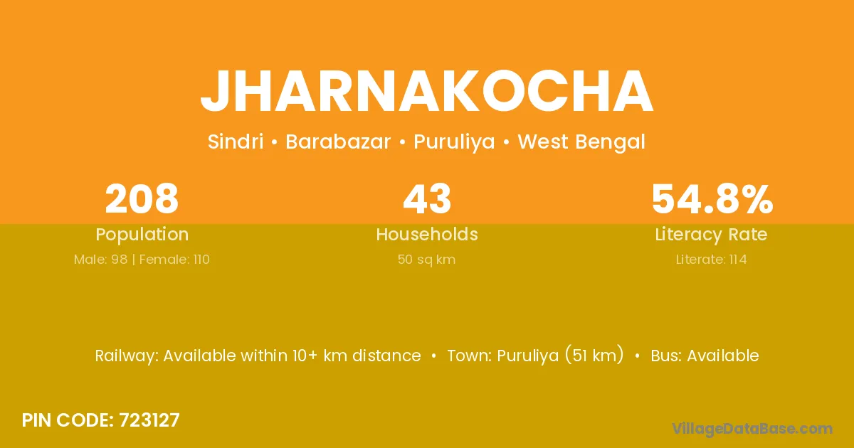 Puruliya (51 km) is the nearest town to Jharnakocha village for major economic activities and is located approximately 51 km away.