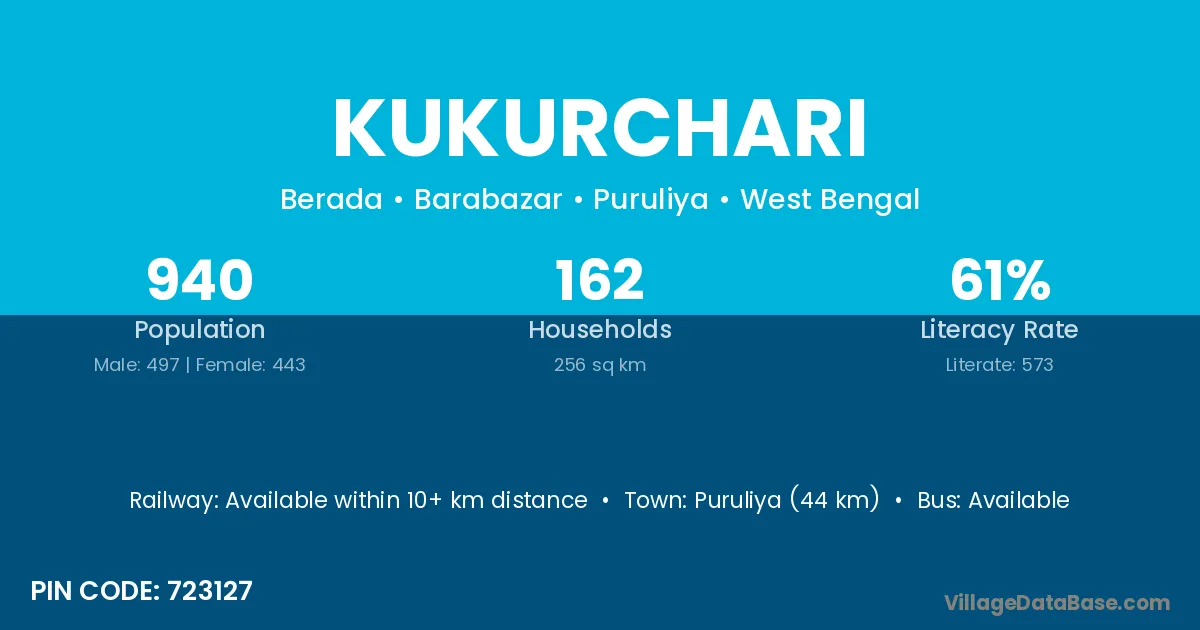 Puruliya (44 km) is the nearest town to Kukurchari village for major economic activities and is located approximately 44 km away.