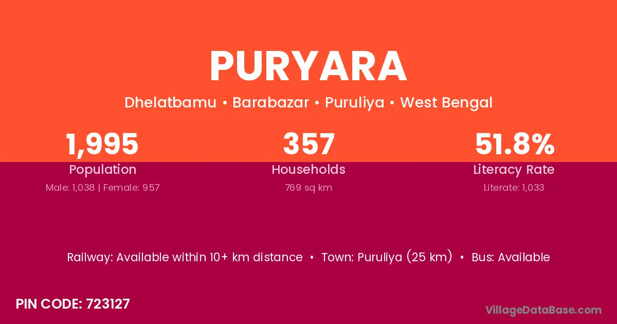 Puruliya (25 km) is the nearest town to Puryara village for major economic activities and is located approximately 25 km away.