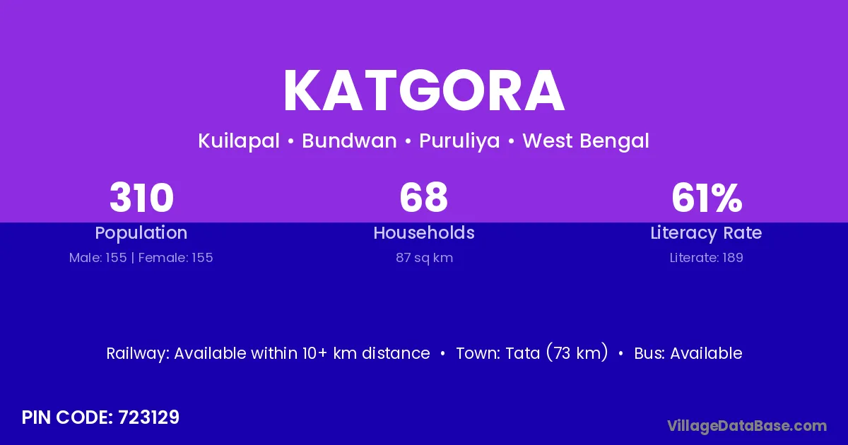 Tata (73 km) is the nearest town to Katgora village for major economic activities and is located approximately 73 km away.
