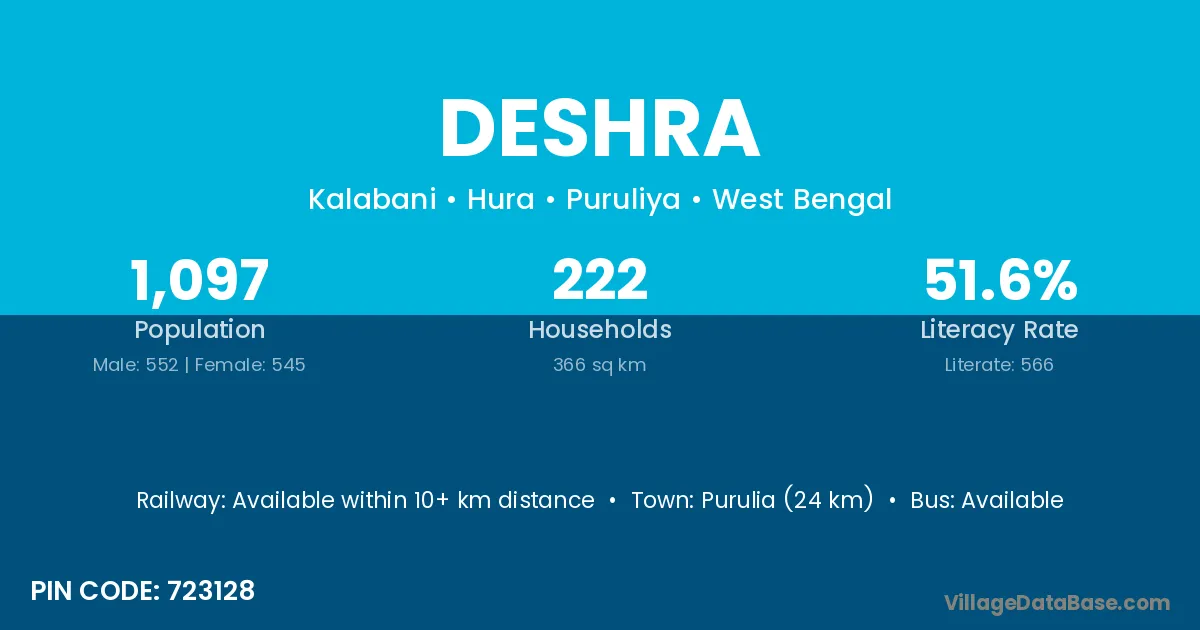 Purulia (24 km) is the nearest town to Deshra village for major economic activities and is located approximately 24 km away.