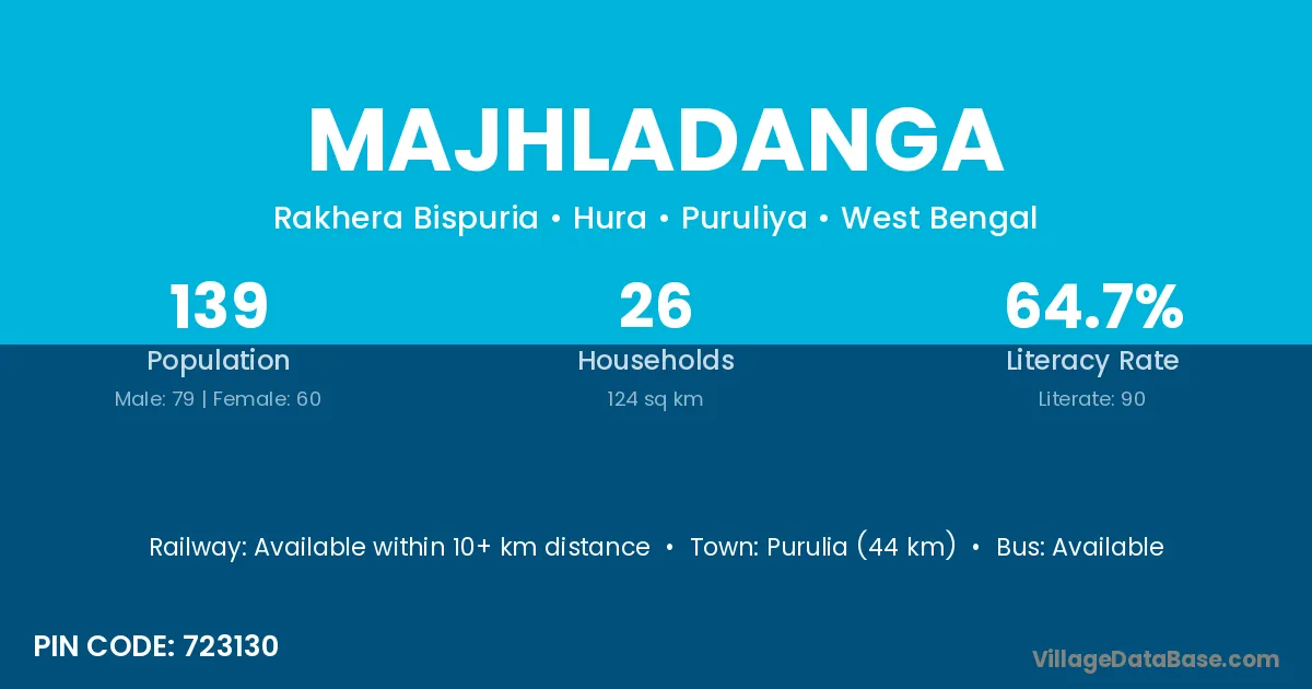 Purulia (44 km) is the nearest town to Majhladanga village for major economic activities and is located approximately 44 km away.