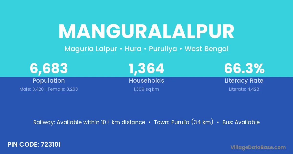 Purulia (34 km) is the nearest town to Manguralalpur village for major economic activities and is located approximately 34 km away.