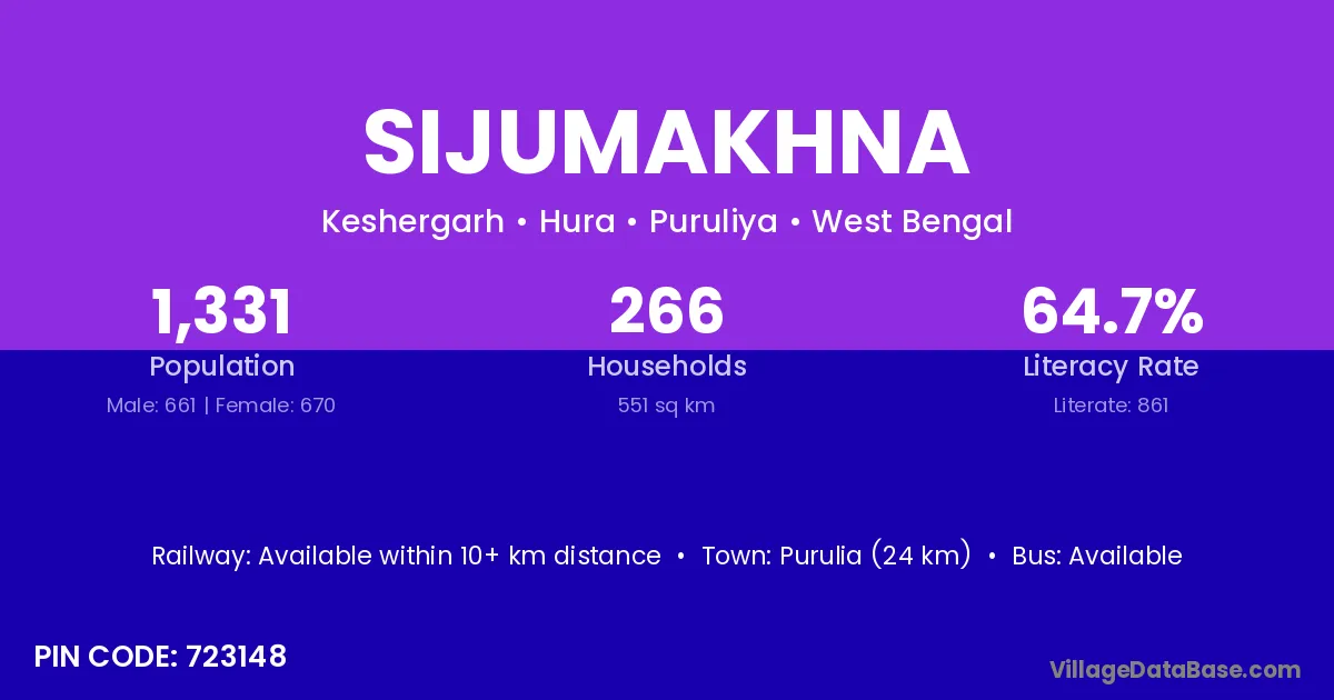 Purulia (24 km) is the nearest town to Sijumakhna village for major economic activities and is located approximately 24 km away.