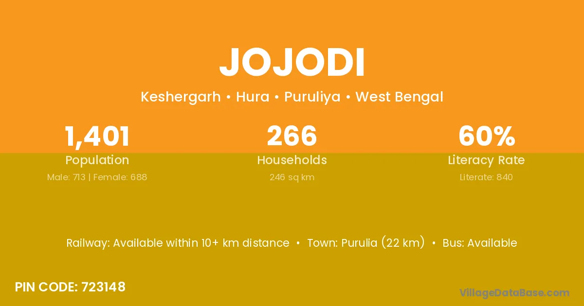 Purulia (22 km) is the nearest town to Jojodi village for major economic activities and is located approximately 22 km away.