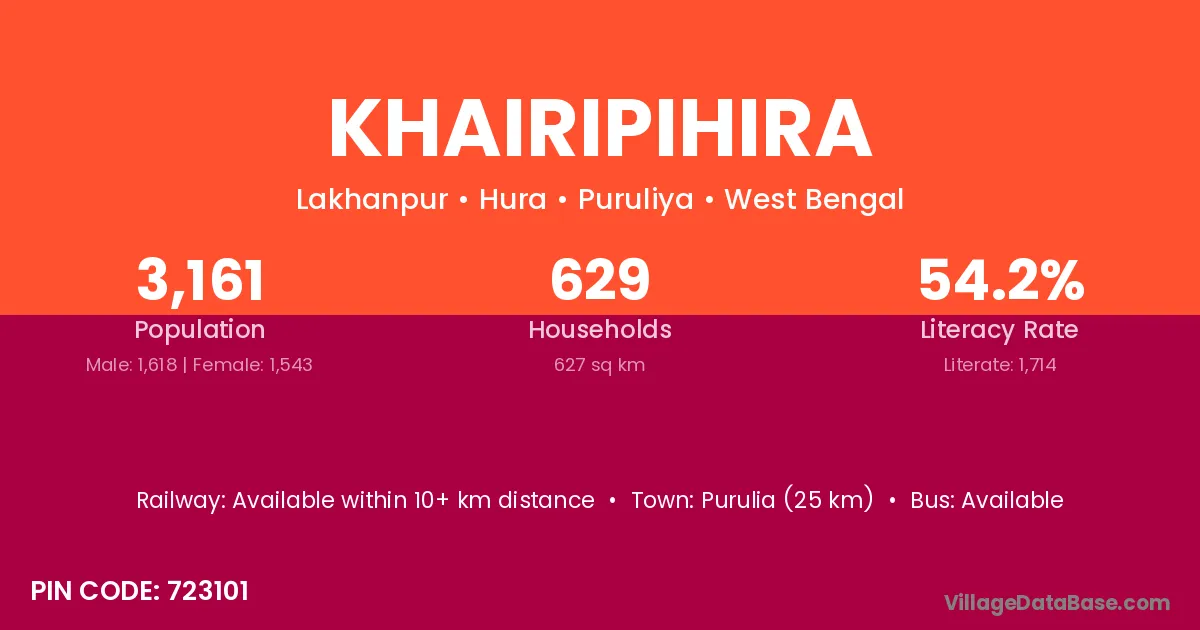 Purulia (25 km) is the nearest town to Khairipihira village for major economic activities and is located approximately 25 km away.