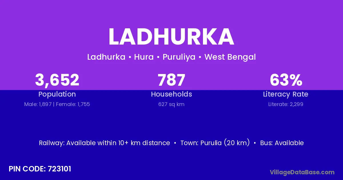 Ladhurka village is located in the Hura Subdivision of the Puruliya district in West Bengal.