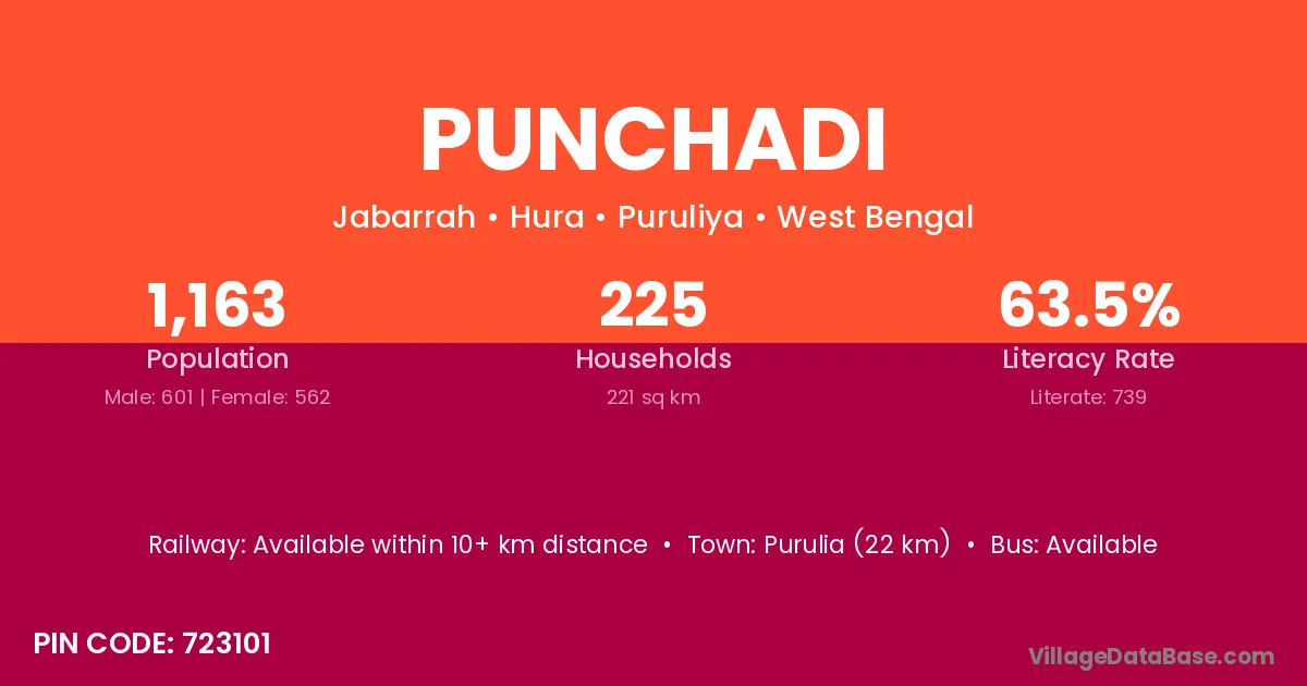 Purulia (22 km) is the nearest town to Punchadi village for major economic activities and is located approximately 22 km away.