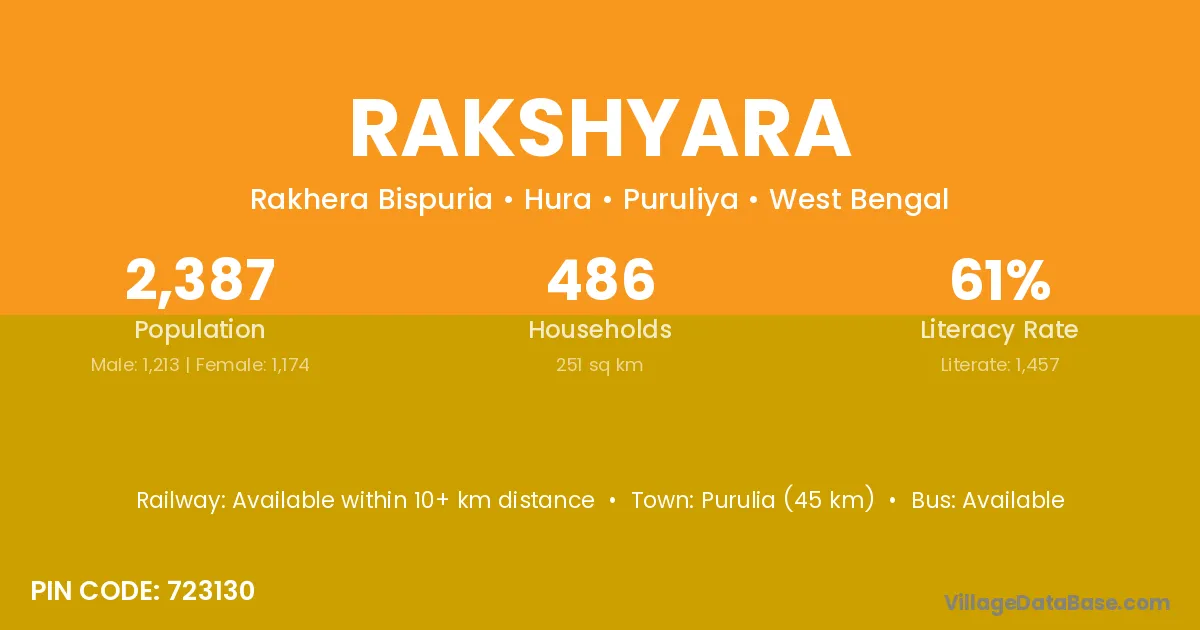 Purulia (45 km) is the nearest town to Rakshyara village for major economic activities and is located approximately 45 km away.