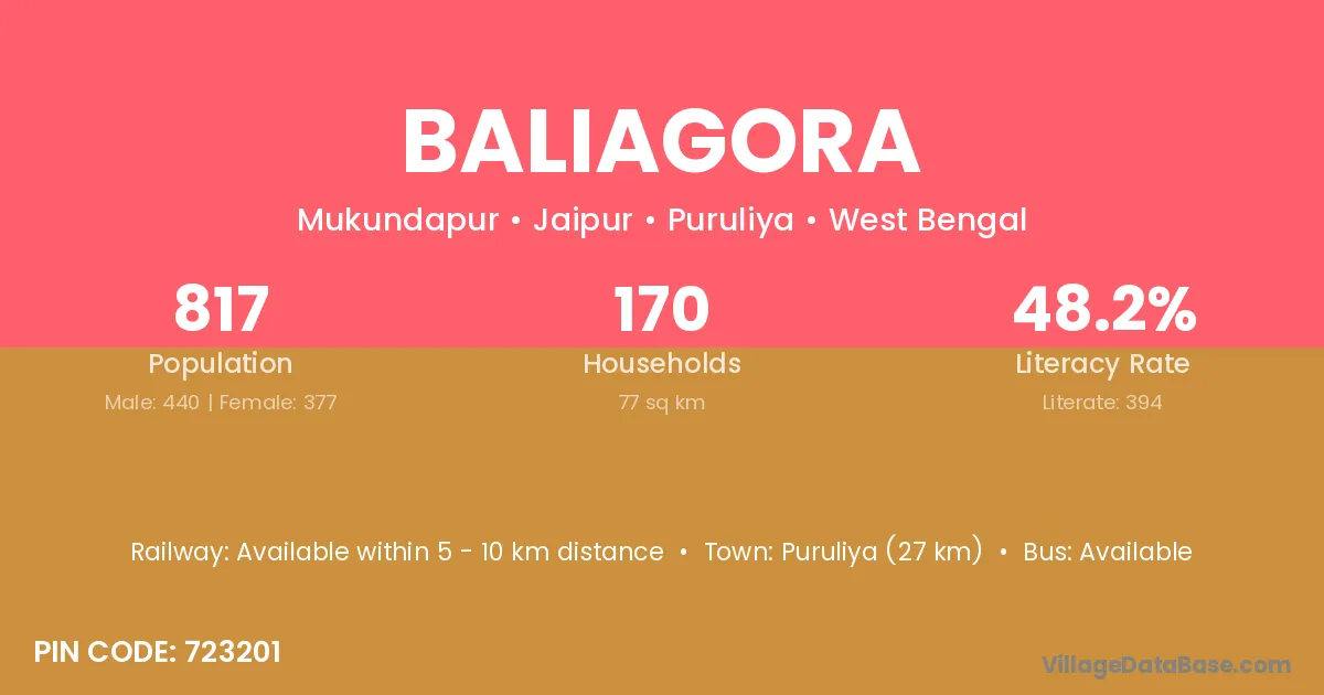 Puruliya (27 km) is the nearest town to Baliagora village for major economic activities and is located approximately 27 km away.