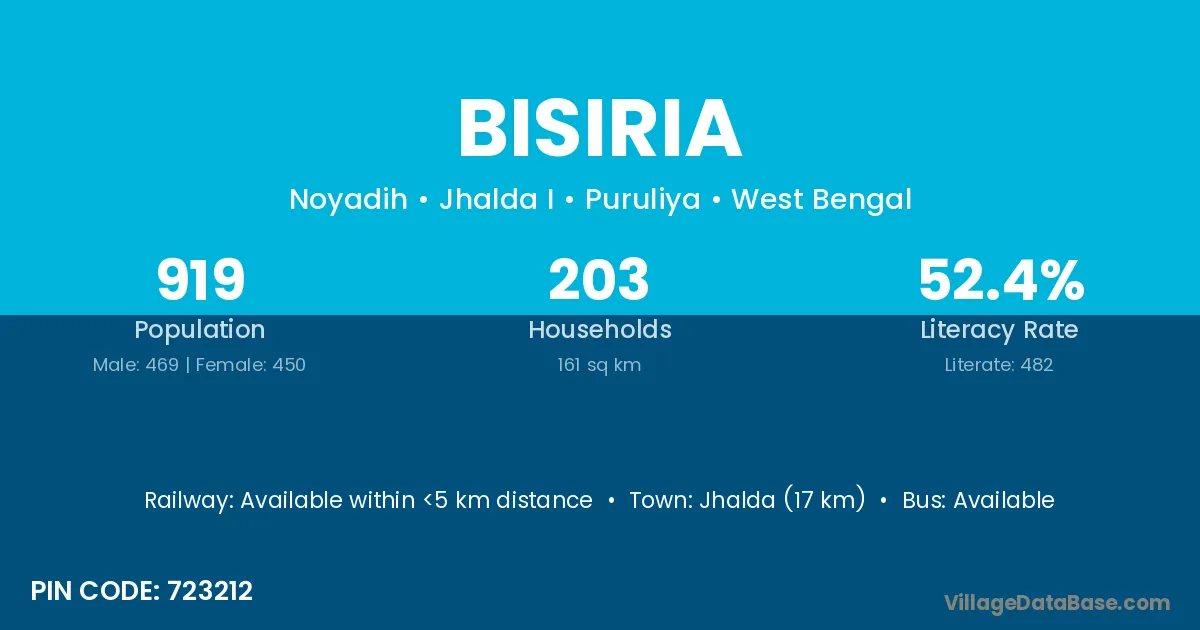 Bisiria village is located in the Jhalda I Subdivision of the Puruliya district in West Bengal.