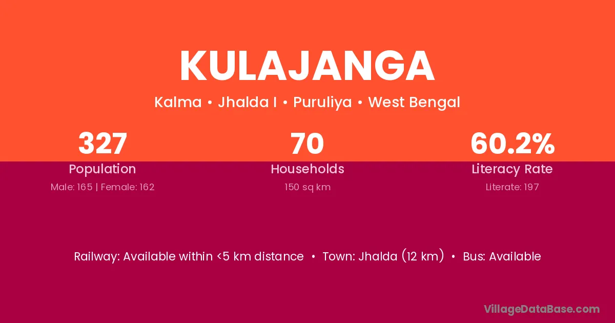 Jhalda (12 km) is the nearest town to Kulajanga village for major economic activities and is located approximately 12 km away.