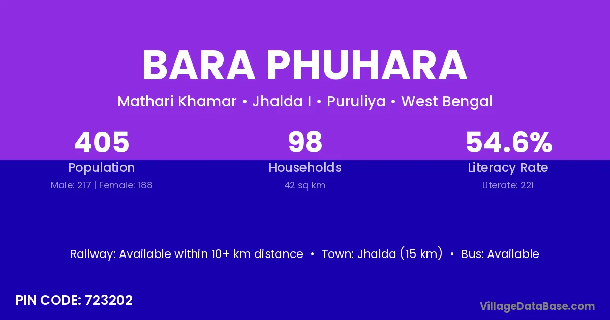 Jhalda (15 km) is the nearest town to Bara Phuhara village for major economic activities and is located approximately 15 km away.