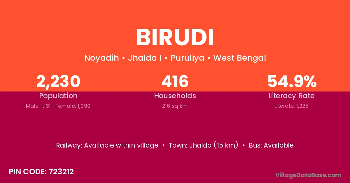 Jhalda (15 km) is the nearest town to Birudi village for major economic activities and is located approximately 15 km away.