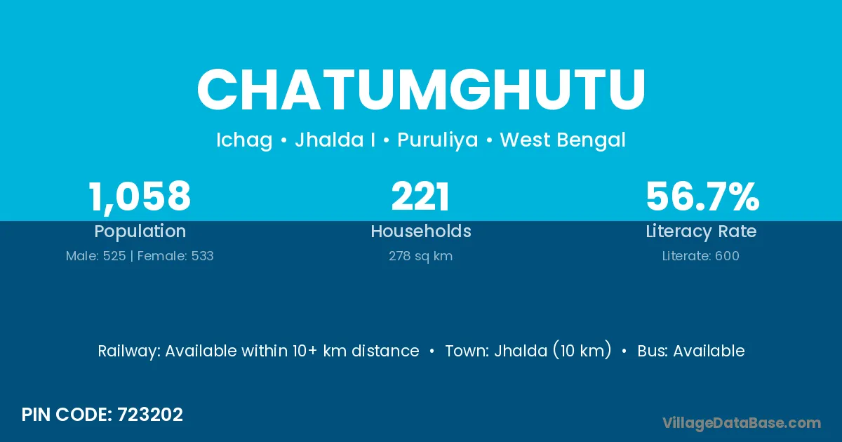 Jhalda (10 km) is the nearest town to Chatumghutu village for major economic activities and is located approximately 10 km away.
