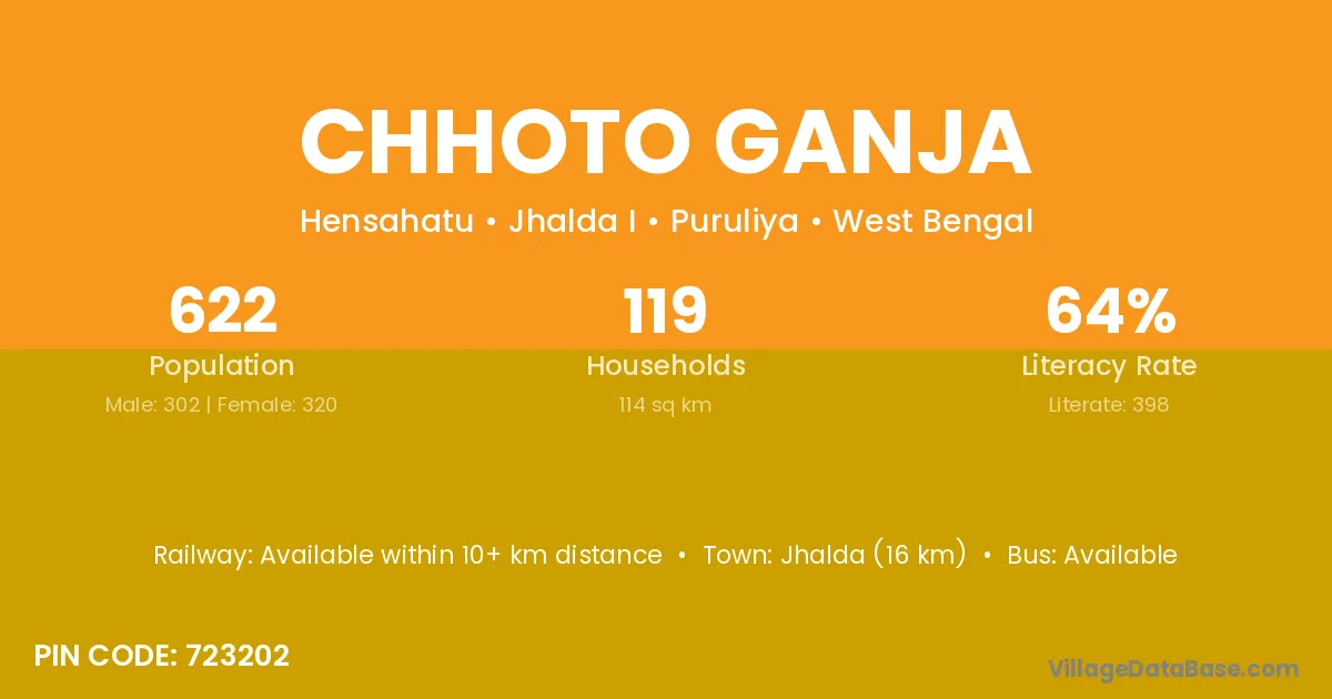 Jhalda (16 km) is the nearest town to Chhoto Ganja village for major economic activities and is located approximately 16 km away.