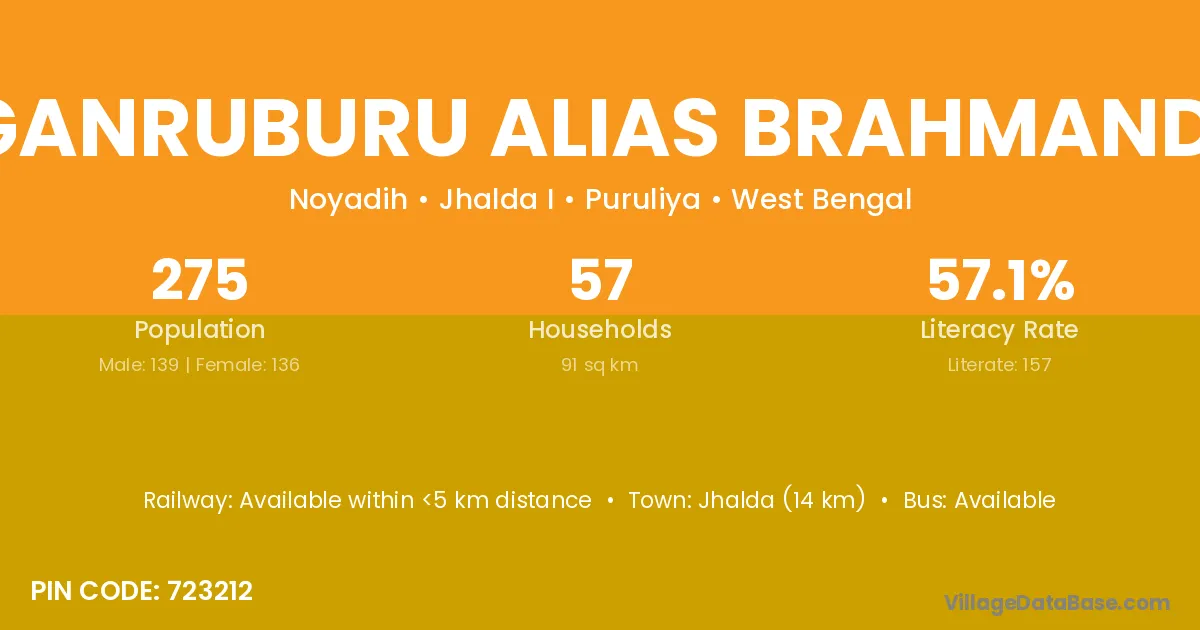 Jhalda (14 km) is the nearest town to Ganruburu Alias Brahmandi village for major economic activities and is located approximately 14 km away.