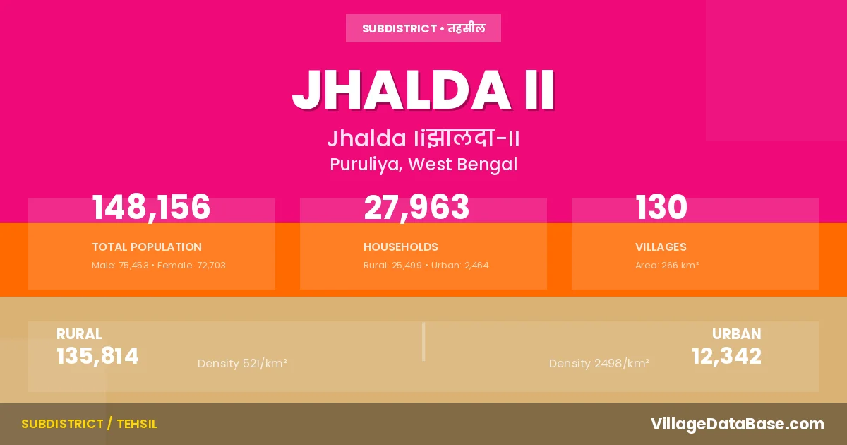 According to the 2011 census The total area of Jhalda II Subdivision is 266 km², with a population of 148156 people. The population density is 558 inhabitants per square kilometre, and there are approximately 27963 houses in the sub district.