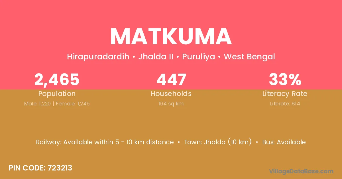 Matkuma village is located in the Jhalda II Subdivision of the Puruliya district in West Bengal.