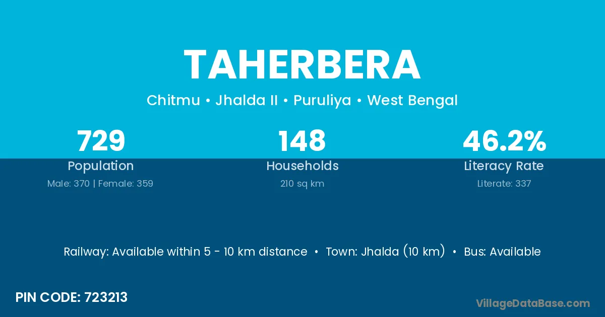 Jhalda (10 km) is the nearest town to Taherbera village for major economic activities and is located approximately 10 km away.