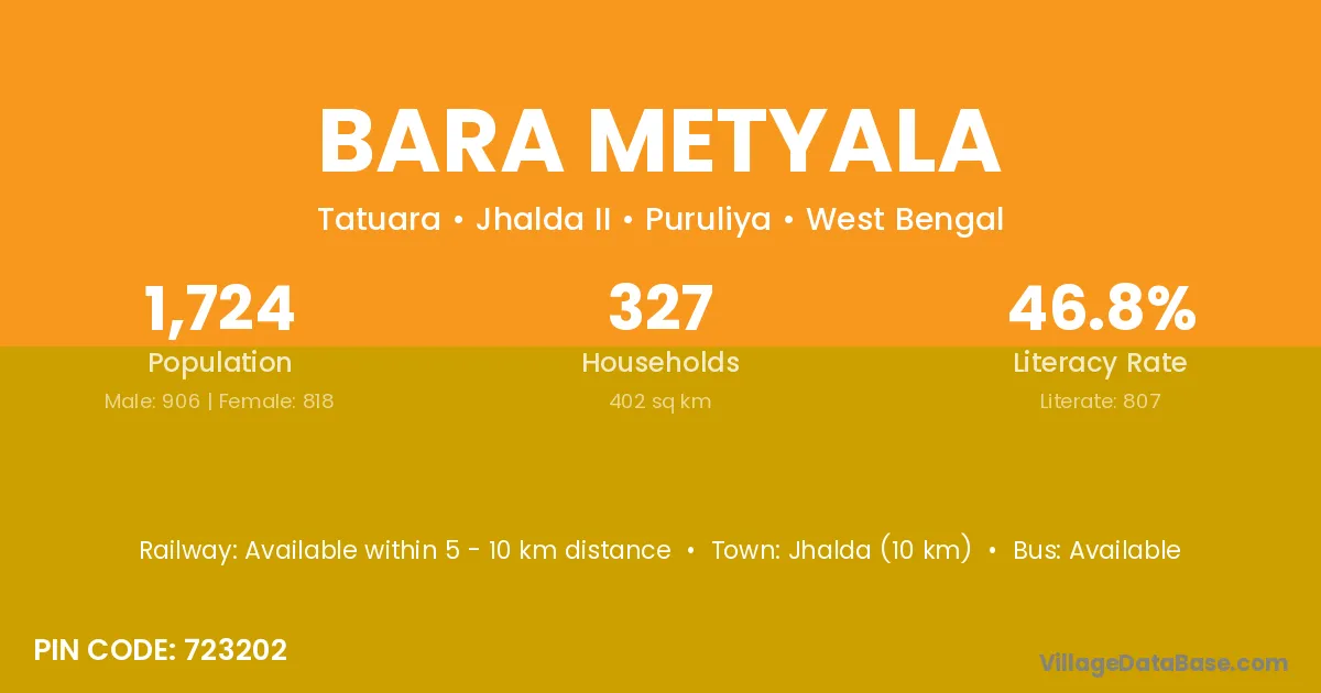 Jhalda (10 km) is the nearest town to Bara Metyala village for major economic activities and is located approximately 10 km away.
