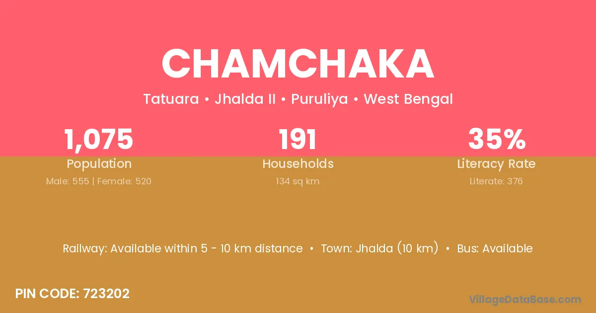 Chamchaka village is located in the Jhalda II Subdivision of the Puruliya district in West Bengal.