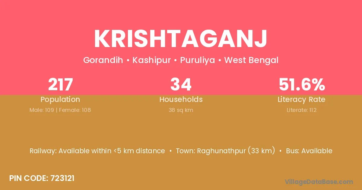 Raghunathpur (33 km) is the nearest town to Krishtaganj village for major economic activities and is located approximately 33 km away.
