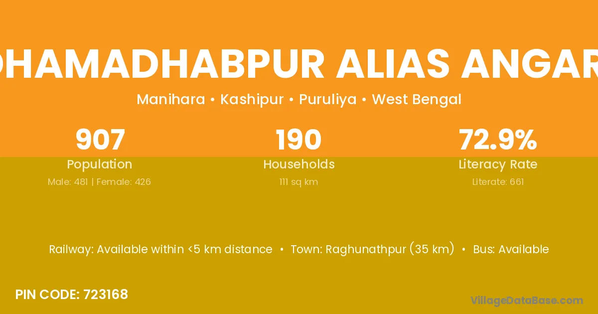 Raghunathpur (35 km) is the nearest town to Radhamadhabpur Alias Angaradi village for major economic activities and is located approximately 35 km away.