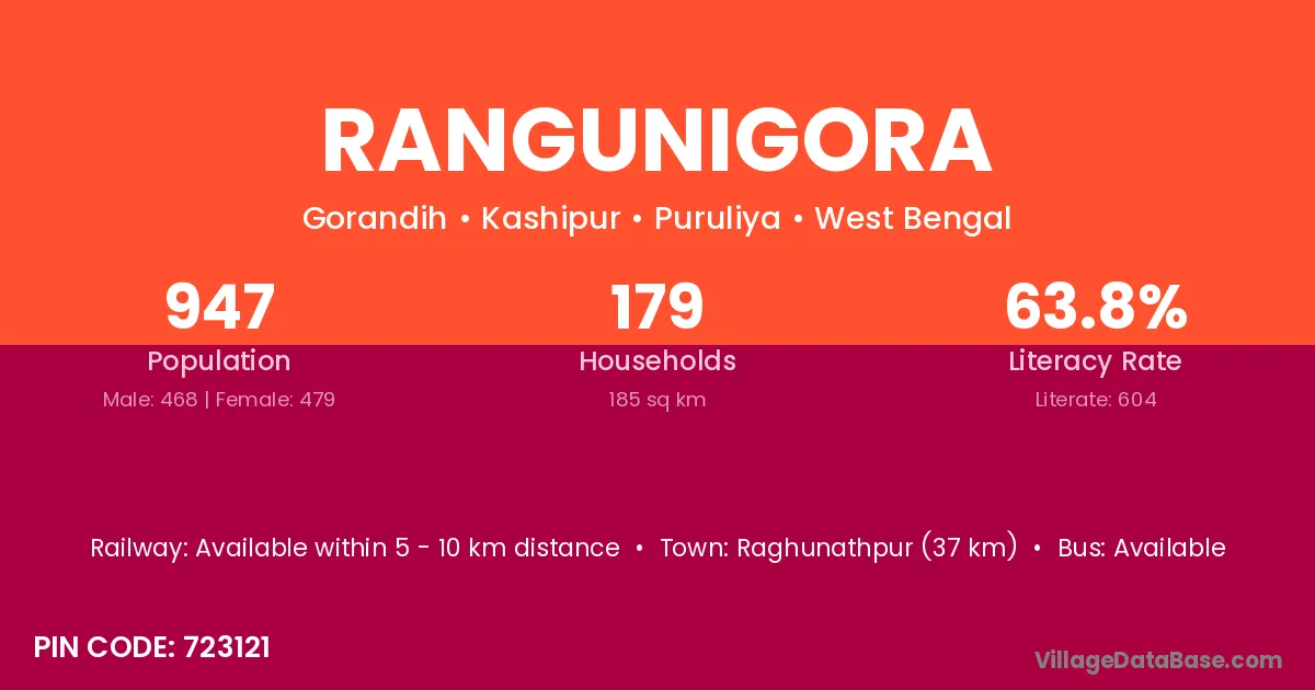 Raghunathpur (37 km) is the nearest town to Rangunigora village for major economic activities and is located approximately 37 km away.