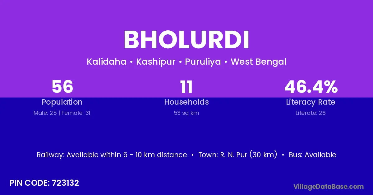 Bholurdi village has a total population of 56 people, of which 25 are males and 31 are females.