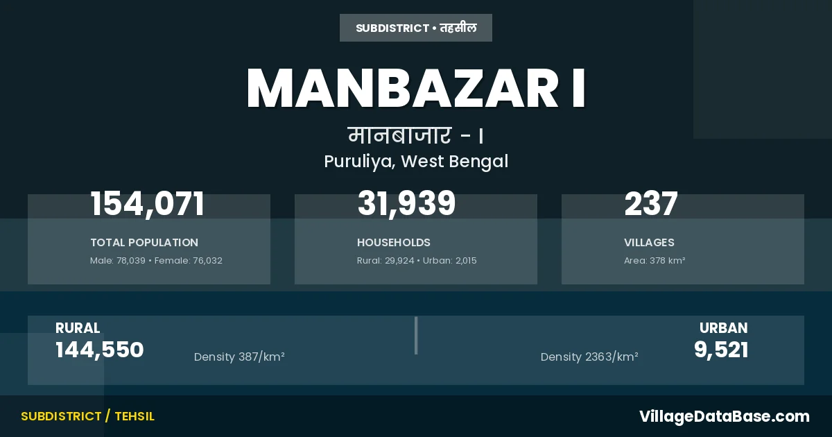 According to the 2011 census The total area of Manbazar I Subdivision is 378 km², with a population of 154071 people. The population density is 408 inhabitants per square kilometre, and there are approximately 31939 houses in the sub district.