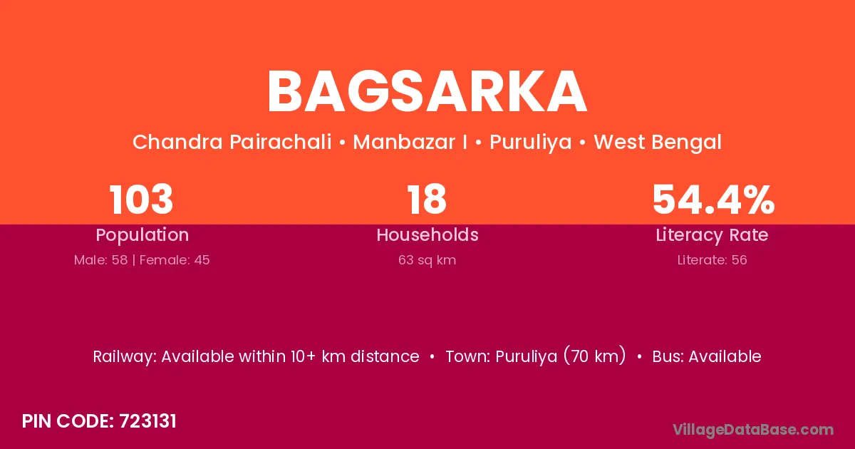 Puruliya (70 km) is the nearest town to Bagsarka village for major economic activities and is located approximately 70 km away.