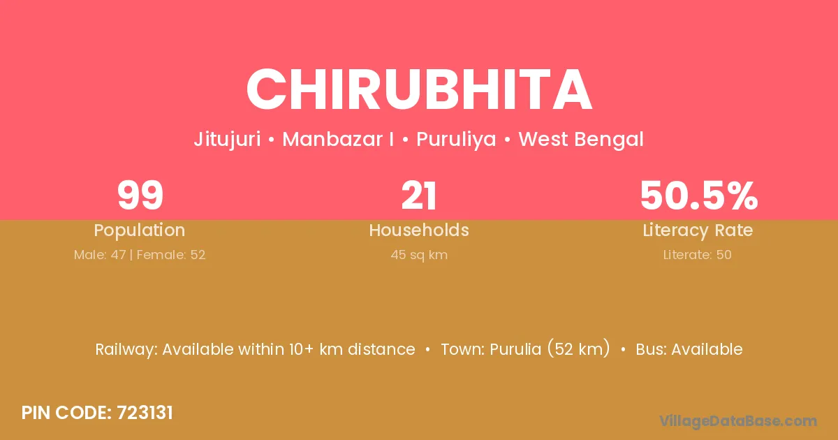 Purulia (52 km) is the nearest town to Chirubhita village for major economic activities and is located approximately 52 km away.