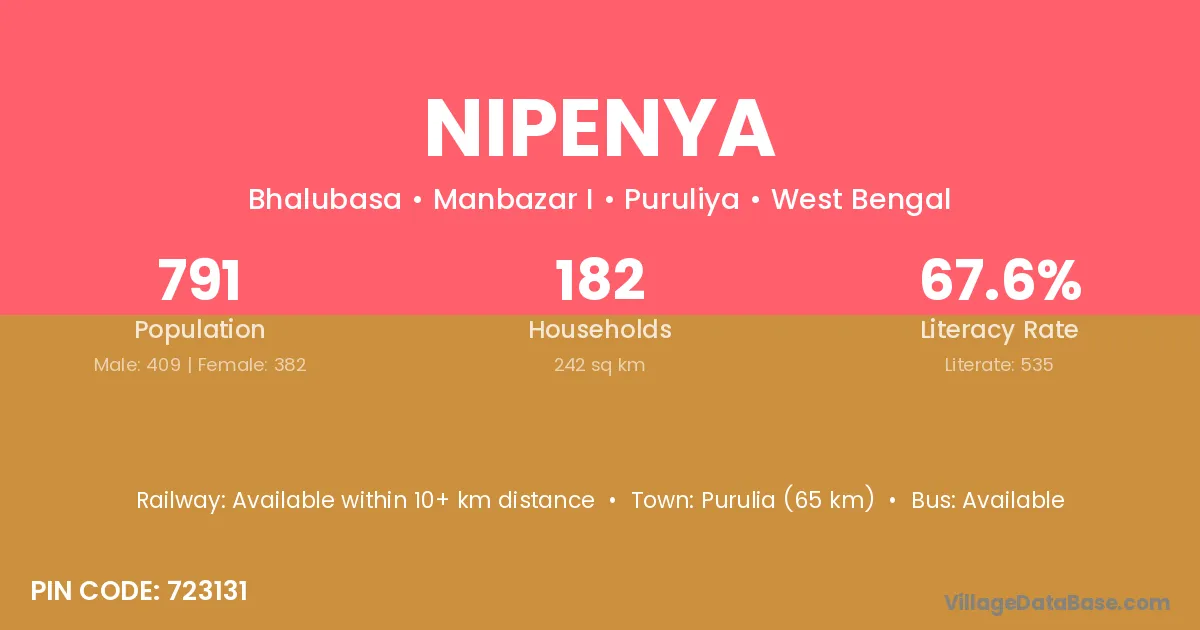 Purulia (65 km) is the nearest town to Nipenya village for major economic activities and is located approximately 65 km away.