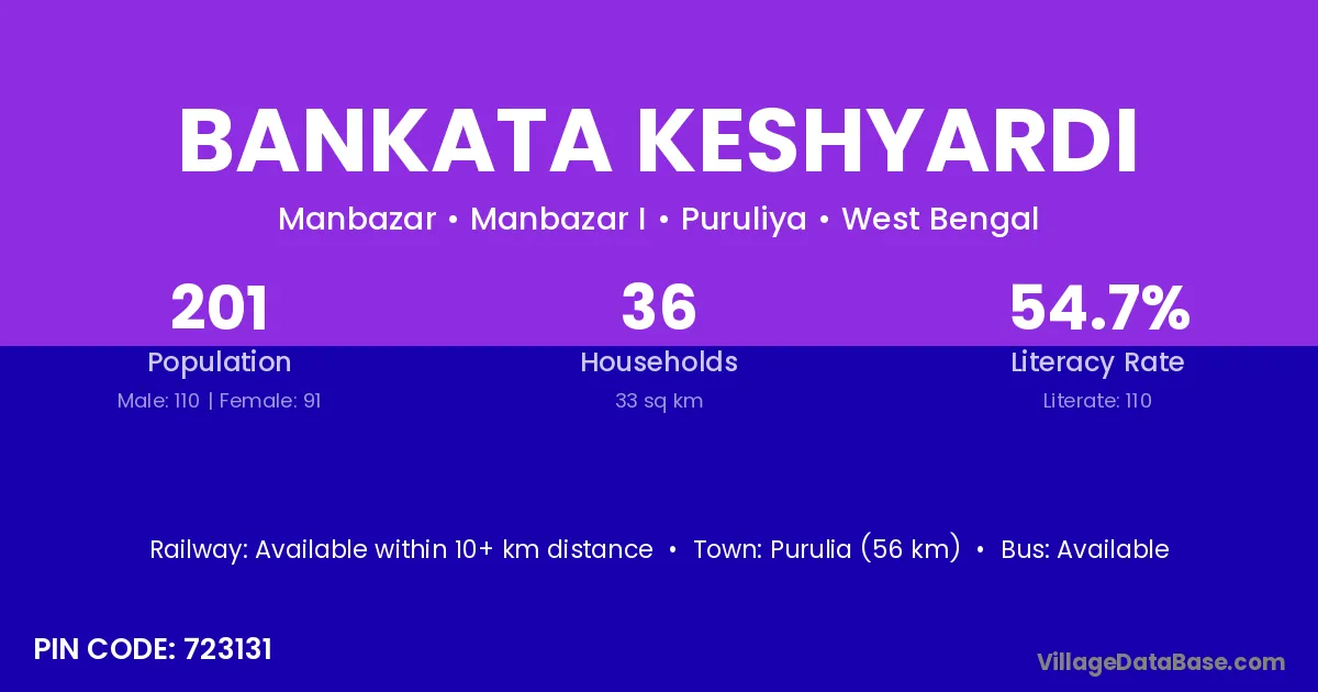 Purulia (56 km) is the nearest town to Bankata Keshyardi village for major economic activities and is located approximately 56 km away.