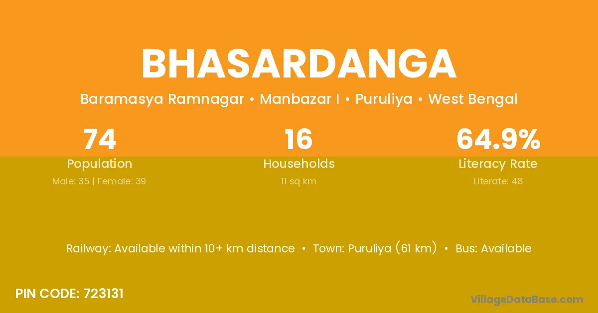 Puruliya (61 km) is the nearest town to Bhasardanga village for major economic activities and is located approximately 61 km away.