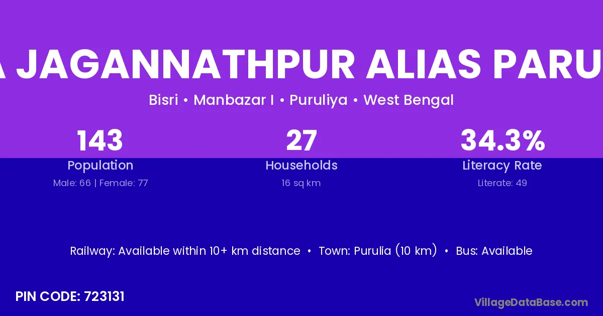 Purulia (10 km) is the nearest town to Chhota Jagannathpur Alias Paruldanga village for major economic activities and is located approximately 10 km away.