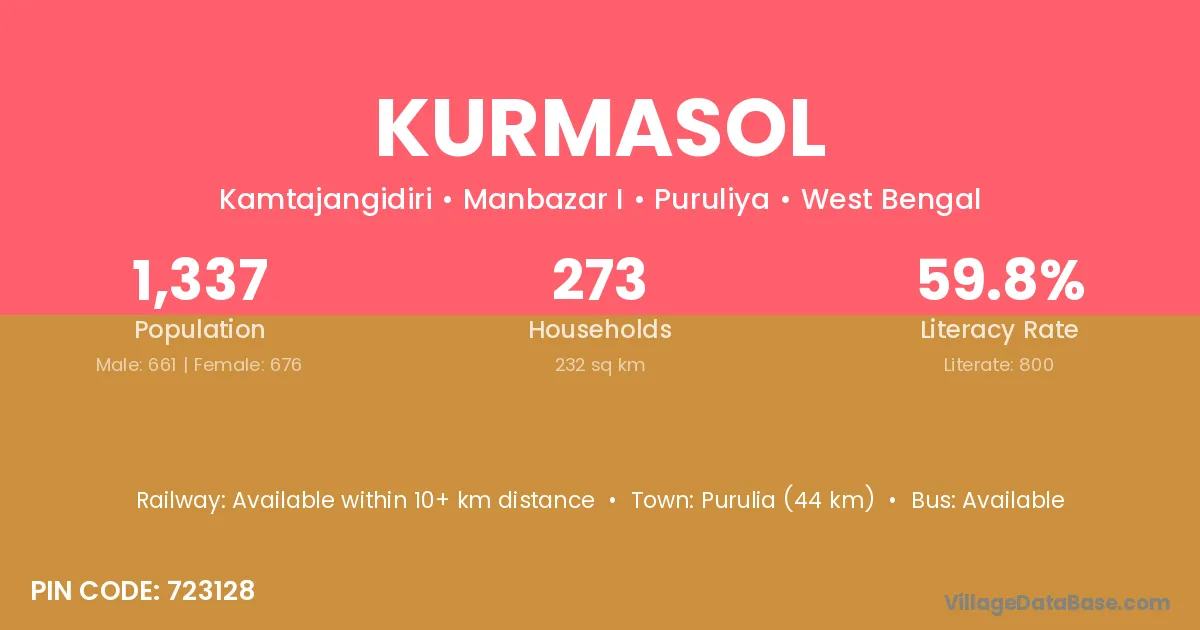 Purulia (44 km) is the nearest town to Kurmasol village for major economic activities and is located approximately 44 km away.