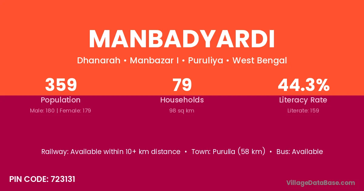 Purulia (58 km) is the nearest town to Manbadyardi village for major economic activities and is located approximately 58 km away.