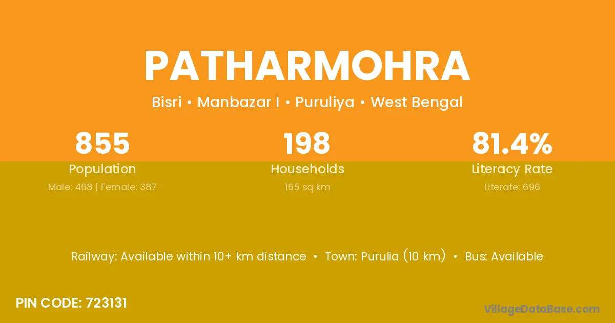 Purulia (10 km) is the nearest town to Patharmohra village for major economic activities and is located approximately 10 km away.