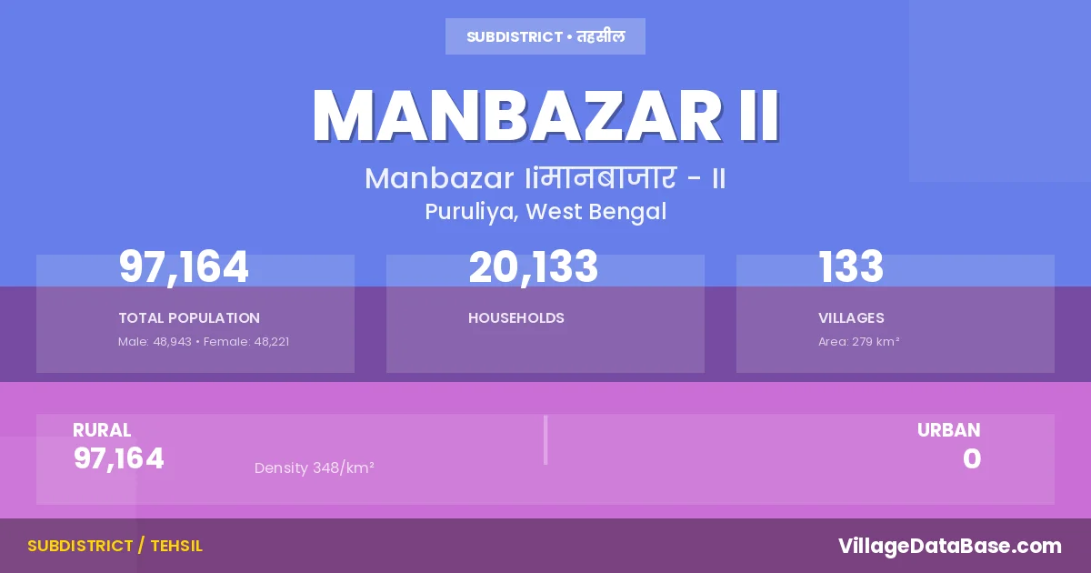 According to the 2011 census The total area of Manbazar II Subdivision is 279 km², with a population of 97164 people. The population density is 348 inhabitants per square kilometre, and there are approximately 20133 houses in the sub district.
