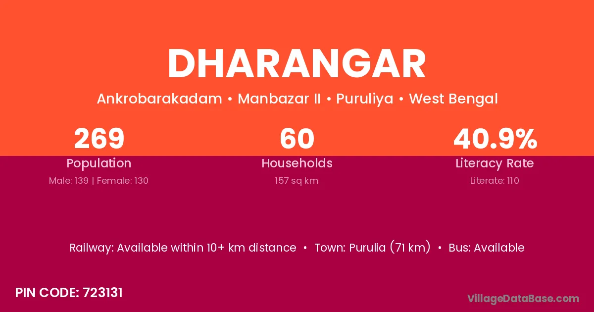 Purulia (71 km) is the nearest town to Dharangar village for major economic activities and is located approximately 71 km away.