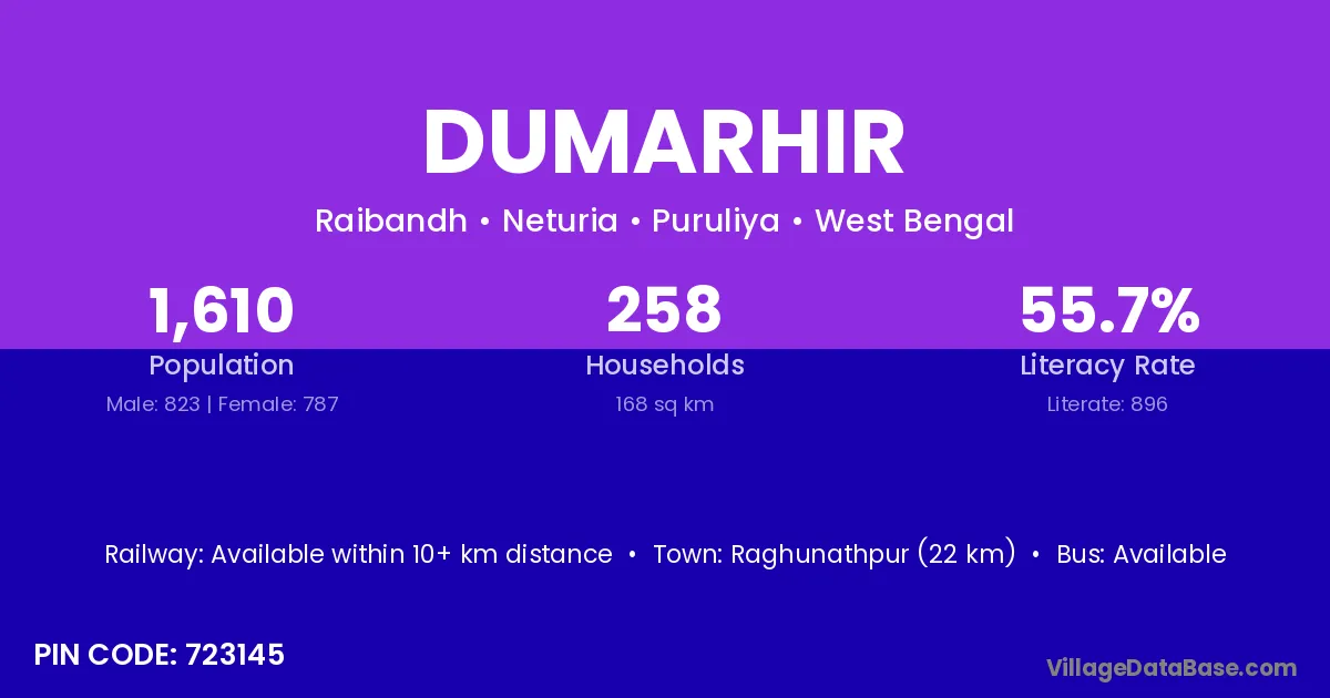 Raghunathpur (22 km) is the nearest town to Dumarhir village for major economic activities and is located approximately 22 km away.