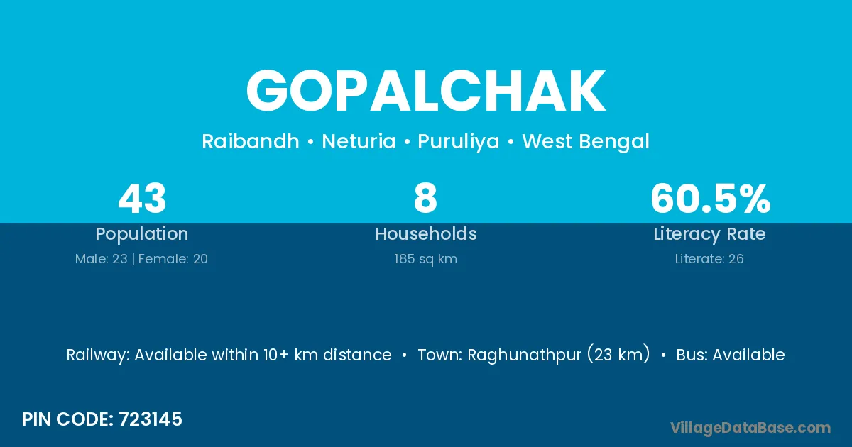 Raghunathpur (23 km) is the nearest town to Gopalchak village for major economic activities and is located approximately 23 km away.
