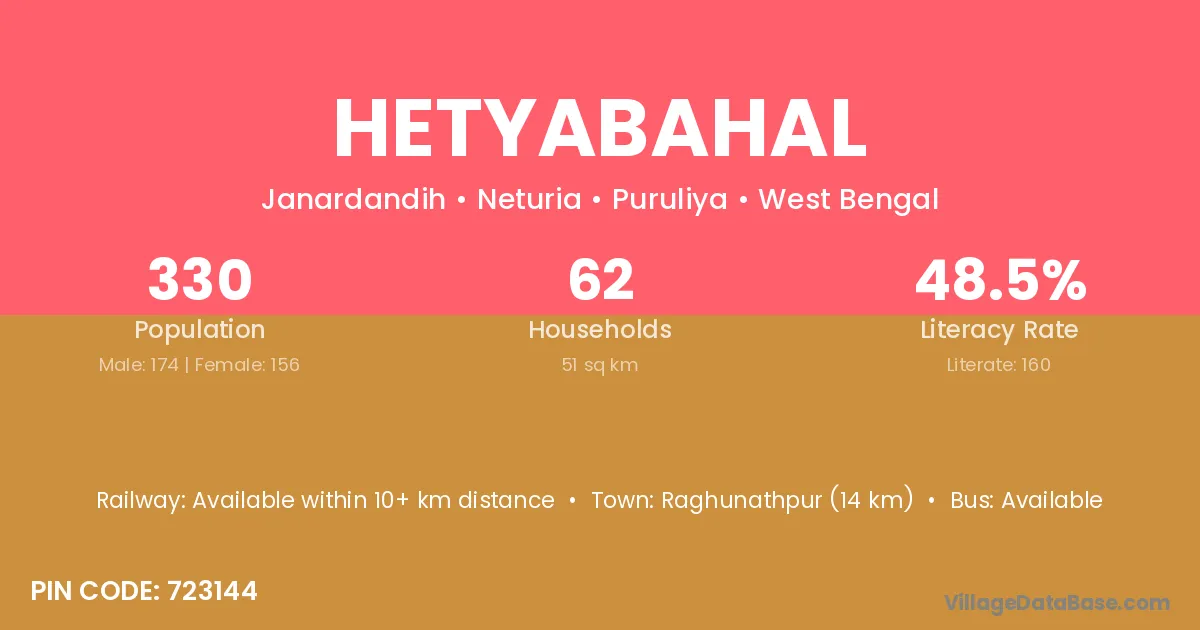 Raghunathpur (14 km) is the nearest town to Hetyabahal village for major economic activities and is located approximately 14 km away.